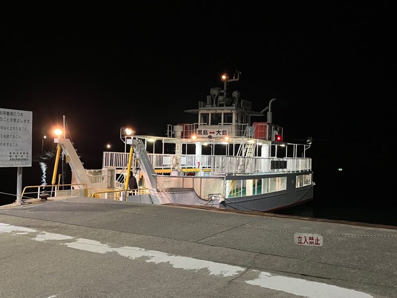 大島へはまず黒島港から渡海船に乗って渡ります。この日は臨時便が2便運航しており、早朝4時35分の便に乗船しました。港や船内には多くの見物客が集まっていました。この日は、新居浜市内の最低気温がマイナス2.7度だったこともあり、皆さん暖かい服装をしていました🧥