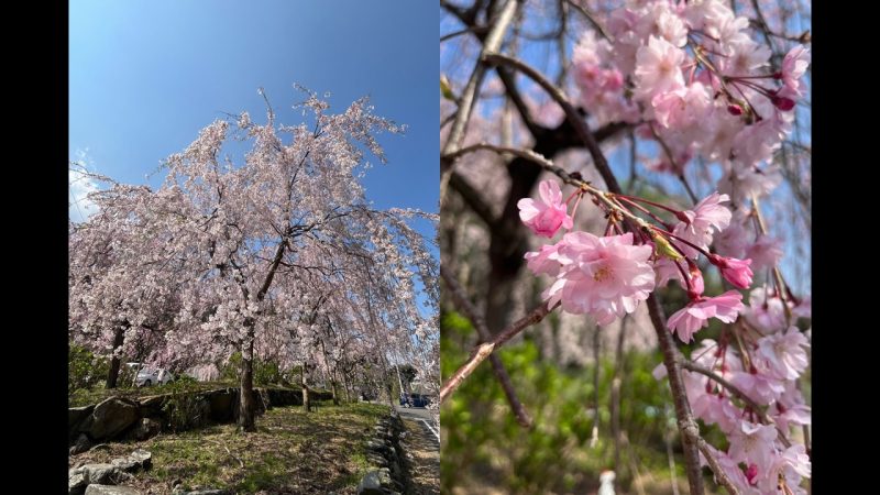 ここは、見事な枝垂桜(しだれざくら)が有名で、例年4月上旬頃が見頃です。新長谷寺の入り口付近で美しい桜を楽しめます。🌸