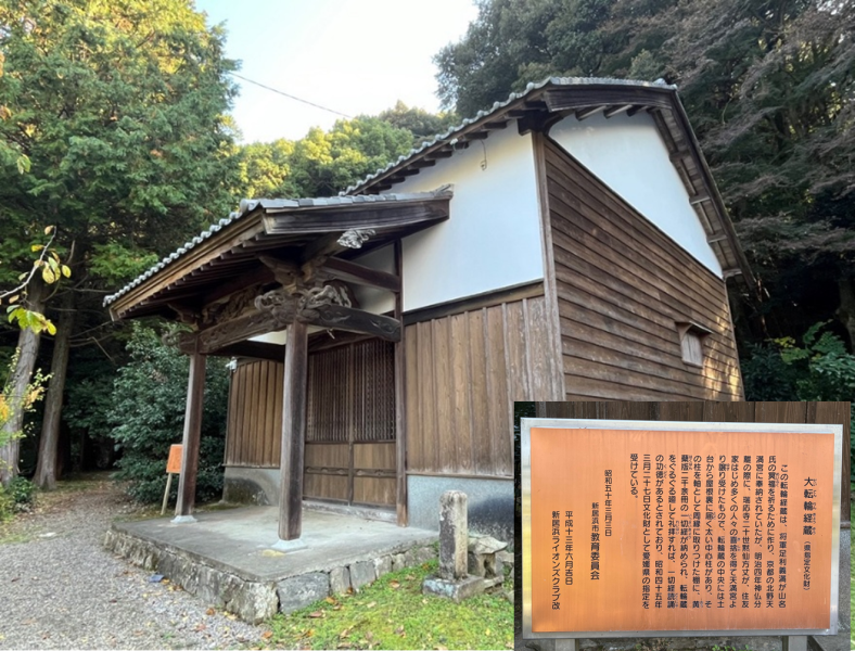 大転輪蔵(だいてんりんぞう)とは、「一切蔵経」という経典をしまうための回転式の書庫(本棚)です。もともとは京都の北野天満宮の境内に建てられていましたが、明治時代に出された神仏分離令によって、ここに移されました。能楽の謡曲「輪蔵」にも謡われている、歴史的に由緒ある法宝で、県の有形文化財にも指定されています。